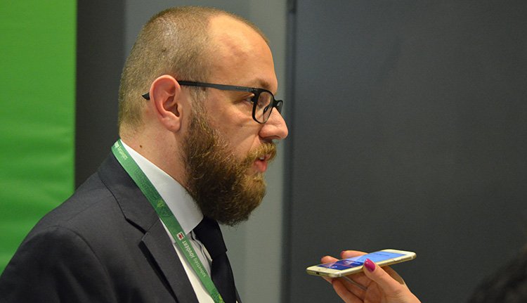 Porcsalmi Bálint ügyvezető elnök egy szép női kéznek nyilatkozik.