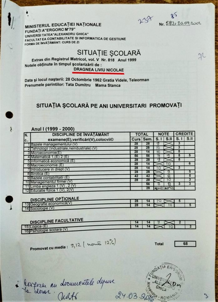 Az ügyészek által összegyűjtött adatok azt mutatják, hogy ez a tanulmányi állapot nem valódi és a legvalószínűbb módon utólag vetették papírra. Erre az a legerősebb bizonyíték, hogy az Alexandru Ghica Tudományegyetemet 2000-ben hozták létre, tehát Liviu Dragnea nem kezdhette el 1999-ben a tanulmányait. A nyomozók előtt tett tanúvallomásában maga Dragnea is kaotikusan fogalmazott azzal kapcsolatosan, hogy melyik évben kezdte el az egyetemet, összetévesztve azt a végzés évével: „Nem emlékszem pontosan, de 2003-ban vagy 2004-ben beiratkoztam egy könyvelési profilú karra Alexandriában, melynek Alexandru Ghica volt a neve.” Ugyanebben a tanúvallomásban azt állította, hogy a négy év befejezése után már nem diplomázott le, „mert elértem a célomat, vagyis az ismeretek felhalmozását”.