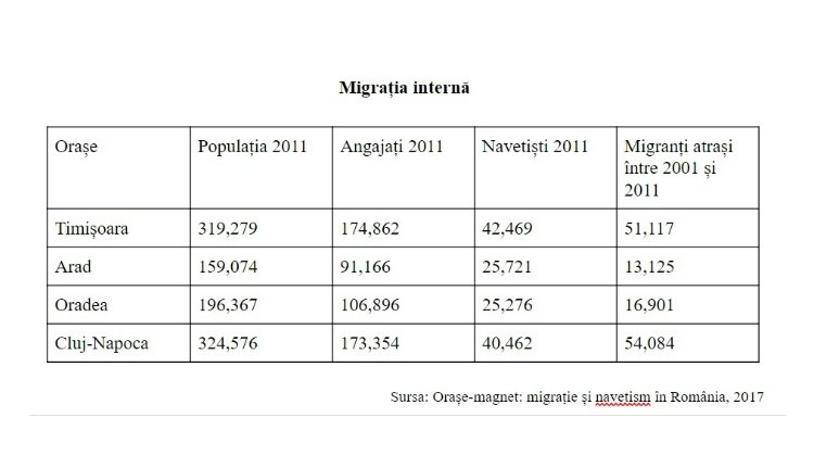 Belső migráció: vízszintes fejléc balról jobbra: város; lakosság 2011; alkalmazott 2011; ingázó 11; 2001 és 2011 között idevonzott migrálók függőleges fejléc felülről lefele: Temesvár; Arad; Nagyvárad; Kolozsvár; forrás: Mágnesvárosok: migráció és ingázás Romániában, 2017