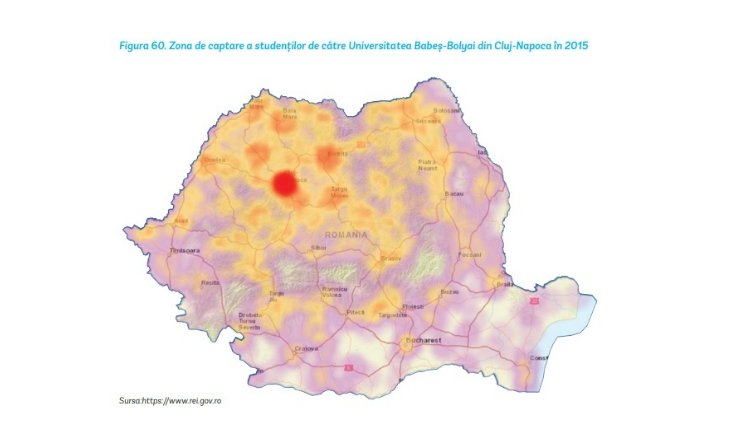 60. ábra. A kolozsvári Babeş–Bolyai Tudományegyetem hallgatóinak származási helye 2015-ben (forrás: Mágnesvárosok: migráció és ingázás Romániában, 2017)