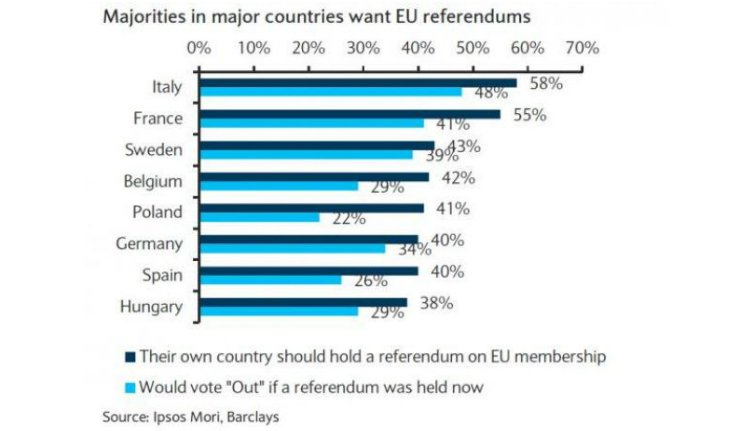 „Létezik egy nyilvánvaló kérdés: miként szavaznának az emberek, ha erre lehetőséget kapnának? Persze, ez egy kicsit hipotetikus ügy. De feltettük, és az általunk elemzett országokban (Franciaország, Spanyolország, Németország, Írország, Lengyelország és Svédország) megfigyeltük, hogy a lakosság egy jelentős csoportja az EU-ban maradásra szavazna. Ennek ellenére nagyon változik a preferencia támogatottsága. Németországban, Spanyolországban vagy Lengyelországban egyértelmű többség van az EU-ban maradás mellett. De ha megnézzük Franciaországot vagy Svédországot, jelentősen csökken a támogatók és az elutasítók közötti különbség. És most azt látjuk, hogy bár továbbra is jelentős többség van az EU-ban maradás mellett, létezik egy jelentős kisebbség, mely már most is azt mondja, hogy egy hipotetikus népszavazás esetén az EXIT mellett szavazna.”