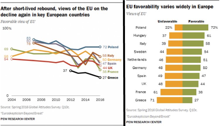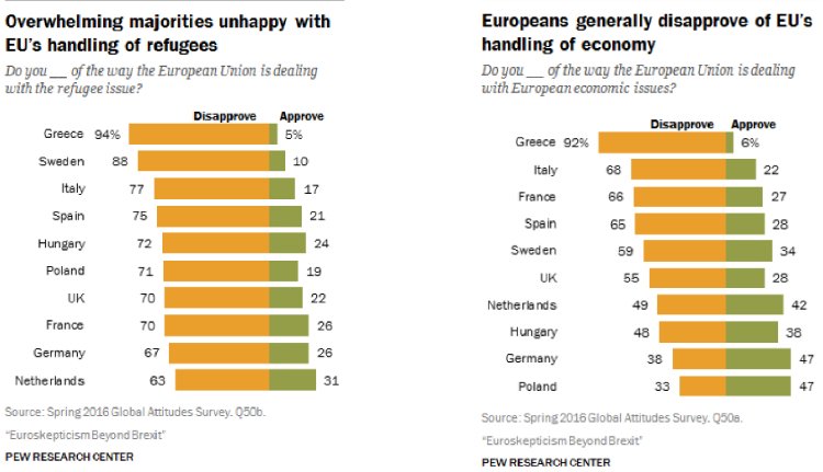 Ha ez a helyzet, akkor nézzük meg a jelenség okait, ahogy az a Pew kutatásából kiderül. Érdekes eredmények, mert grafikonokká változtatva megmutatják azoknak a nyugtalanságoknak a mértékét, melyek rendkívül könnyen átalakulhatnak (vagy átalakíthatók) nemcsak társadalmi robbanásokat és nemzeti politikai színpadokat aláaknázó jelentős okokká, de szertefoszlathatják annak lehetőségét, hogy ilyen-olyan formában folytatható legyen az, amit „európai projektnek” neveztünk el.