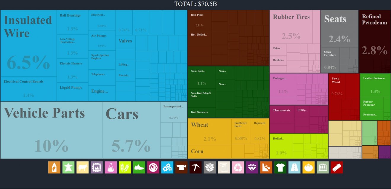 Románia 2017-ben 70 milliárd dollár értékben exportált. A kiviteli úti cél döntő többségét az európai országok jelentik.