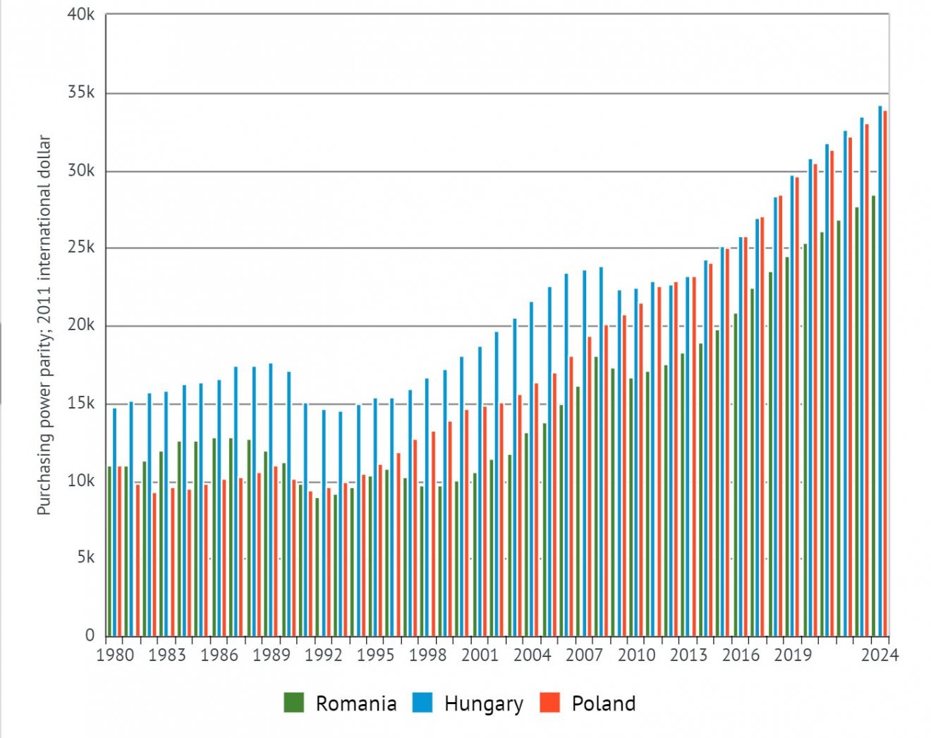 Az 1980 és 1989 közötti időszakban az egy főre eső GDP Romániában (zölddel, állandó árak, vásárlóerő-paritás) alacsony volt Magyarországhoz és viszonylag magasabb a kommunista Lengyelországhoz képest.