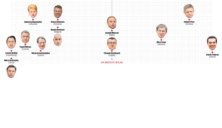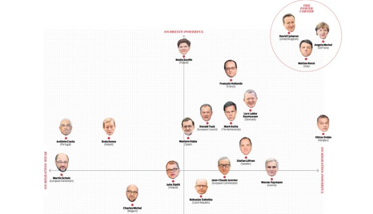 A 28 állam- és kormányfő tárgyalási erejéről szóló grafikonnak van egy kivételezett sarka, ahol azok vannak, akik mindkét témában rendelkeznek tárgyalási képességgel. Angela Merkel német kancellárról, David Cameron brit kormányfőről és Matteo Renzi olasz kormányfőről van szó. Francois Hollande francia elnök nem fér be ebbe a „hatalmi sarokba”, egyrészt azért, mert csak megkésve hozta nyilvánosságra egyértelmű álláspontját, nevezetesen Franciaország aggodalmát Nagy-Britannia EU-n belüli jövőjét illetően, másrészt mert félelmet tanúsít Marine Le Pennel szemben és ez korlátozza mozgásterét a bevándorlás ügyében, kommentálja a Politico.