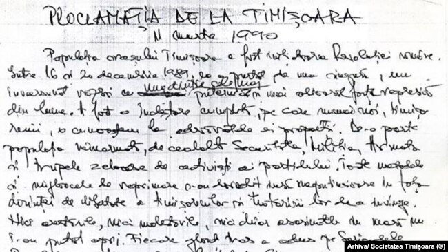 Az igazság szellemében el kell mondanom, hogy George Şerban nem tartozott a kezdeti maghoz, talán azért, mert politikatudományokat oktatott és fenntartásaink voltak vele szemben. De nagyon jók voltak a cikkei. Azon a tüntetésen azt mondta, hogy a Temesvár Társaság ki fog dolgozni egy cikket, mely összefoglalja a forradalom idején skandált jelszavakban kifejezett programot. Hozott egy kezdővázlatot, hosszasan megvitattuk az egész csoporttal, nagyon fontos pontokat adtunk hozzá, mint amilyen a nemzetiségek közötti egyetértést, a temesvári szellemet kihangsúlyozó 4. pont. Aztán a kiáltványt felolvasták és elfogadták a helyi tanácsban, majd – nehezen – a megyei tanácsban is.