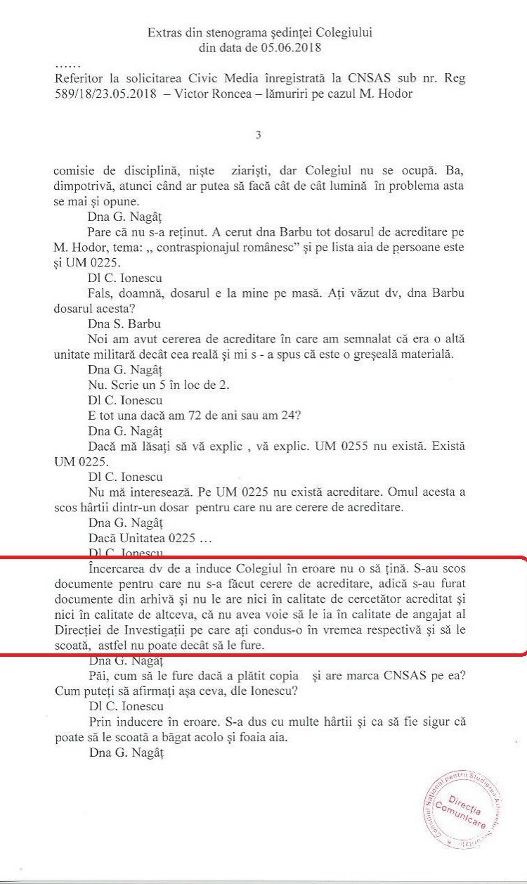 ezúttal a CNSAS alkalmazásában dolgozó kutatóként és Germina Nagâţ alkalmazottjaként, amikor ez utóbbi a nyomozási részleg igazgatója volt, ahogy az a dokumentumhoz tartozó kartonon szereplő, 2015. november 9-i keltezésű kötelező aláírásból kiderül, állítják az Evenimentul Istoricban. Tehát a Hodor–Nagâţ hírszerzőpáros előbb megvárta Zoe Petre halálát, aki sokkal fontosabb név volt a szóban forgó listán, ha figyelembe vesszük a kapcsolatait és azt, hogy Emil Constantinescu alatt ő vezette az országot és csak akkor álltak elő a listával, amikor megfelelőnek tartották a pillanatot egy ártatlan ember besározására, mely lista a SIE által 3 éven keresztül rejtegetett Lucian Boia szereplésével most ellenük fordul. Ez máig rejtve maradt volna a közvélemény előtt – ahogy arra, amúgy, jelenleg is kísérletek történnek –, ha nem robban ki a sajtóbotrány, amibe belerángatták a Román Akadémiát és a CNSAS intézményét.