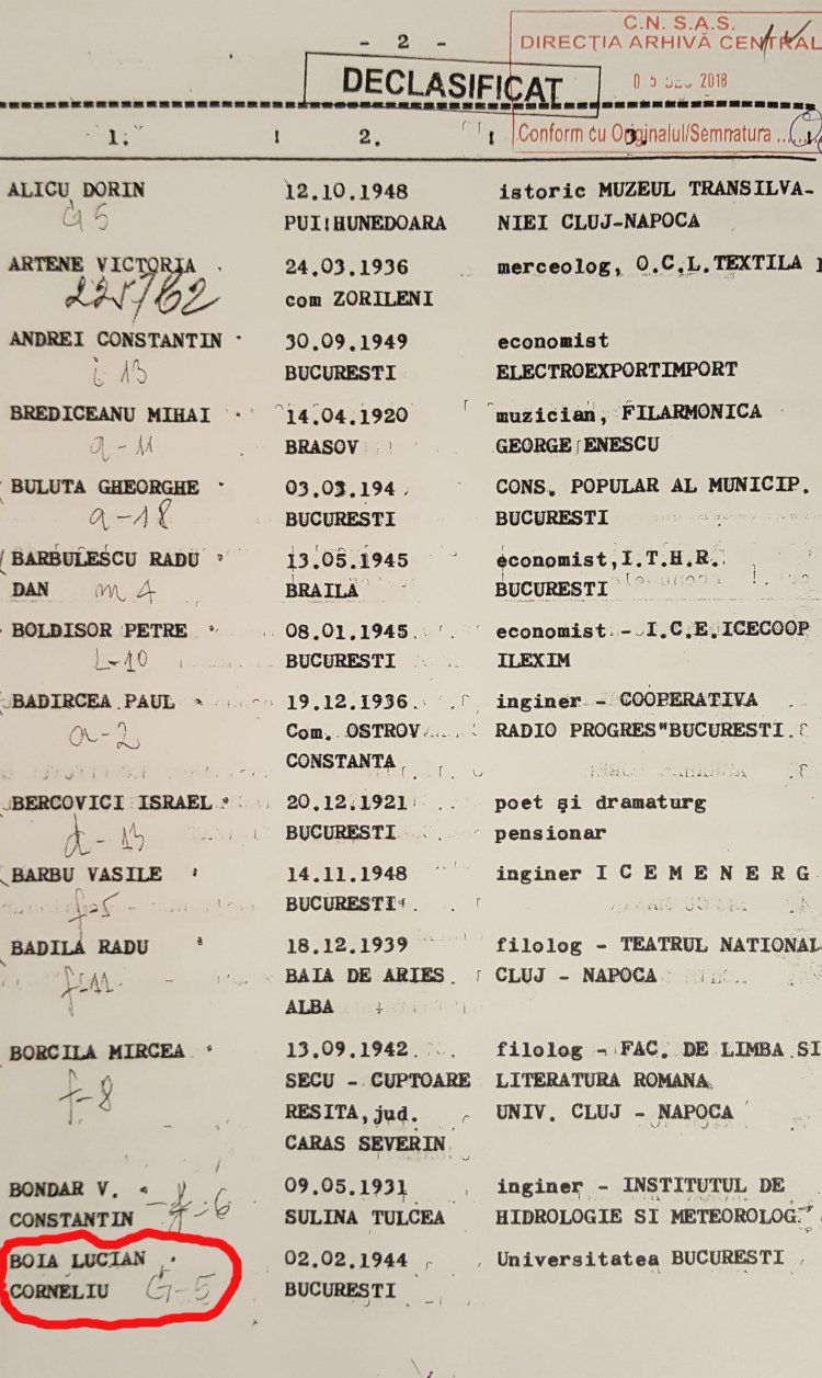 Tekintettel a hajdani szigorúan titkos dokumentumok különleges helyzetére, a SIE tevékenységét ellenőrző parlamenti bizottságnak sürgősen napirendre kellene tűznie egy olyan oldal eltűnését a Securitate egyik aktájából, melyen Lucian Boia neve szerepel, hogy pontosan megállapítsák,