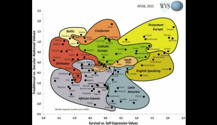 Ronald Inglehart amerikai kutató két tengely mentén csoportosítja az országokat: az egyik a hagyományos és a szekuláris értékeket állítja szembe egymással, a másik pedig a túlélési és az emancipációs értékeket.