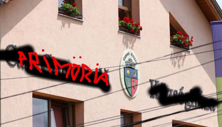 és tüntetőleg a magyarról románra fordított, a román jogrendben elfogadott „Primărie” kifejezést „Casa comunală”-val helyettesítette (a Községháza épületen külön, hivatalos, címeres táblán szerepelt és továbbra is szerepel a román „Primărie” kifejezés; a bírság tárgyát képező feliratok az épület rendeltetését jelezték – a szerk.).