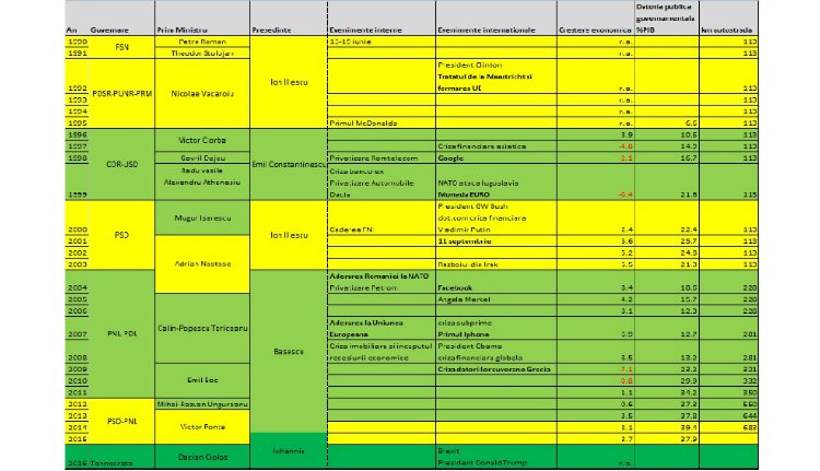 Az alábbi táblázatban összefoglaltam Románia 1989 utáni politikai történelmét. Megpróbáltam összekapcsolni a hatalom politikai színezetét a fő bel- és külpolitikai eseményekkel és a fő gazdasági és fejlesztési mutatókkal.