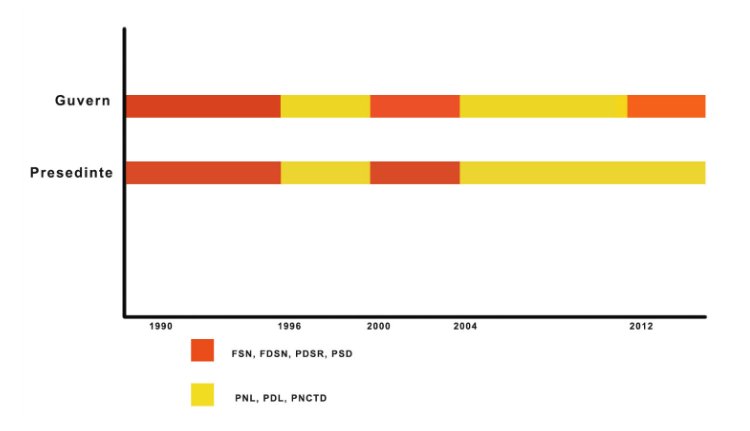 * 26 éven keresztül nagyjából ugyanazok az emberek és eszmék kormányoztak. Románia élén egyszer sem állt egy igazi kívülálló, aki demokratikus módon érvényesült volna, a Cioloş-kormány kivételével (melyet azonban a 2015. októberi körülmények nyomására neveztek ki). Ez azt jelenti, hogy két masszív politikai pólus birtokolta a politikai hatalmat: a szociáldemokrata párt (FDSN, FSN, PDSR, PSD) és a szatellitjei az egyik, valamint a jobbközép pártok (PNL, PNŢCD, PDL) a másik oldalon.