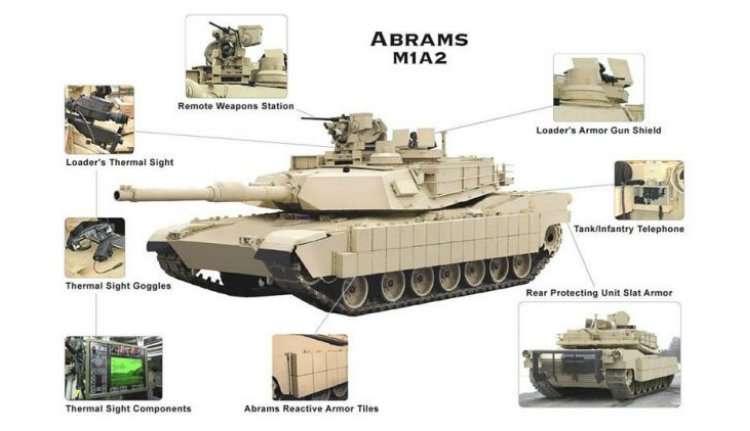 - M1 Abrams tank, nehéz harci tank (63t), 1.500 lóerős motorral, rendkívüli Chobram-páncélzattal (acél és kerámia rétegekből felépített páncélzat), mely kiegészíti a kompozit anyagokkal rétegezett acélfalak vastagságából adódó védelmet. Ezen kívül rendelkezik egy reaktív védelmi rendszerrel is (ez egy páncélozott platformra szerelt kis, a terepet 360 fokban „lefedő” radaron alapul), mely érzékeli az ellenséges rakéták indítását és még a cél elérése előtt semlegesíti őket (a szerző itt összetéveszti a fogalmakat, a reaktív páncélzat ugyanis „ellenrobbanással” semlegesíti a becsapódó támadó fegyvert, amúgy az alábbi fényképen ez látható is – a szerk.). Egy 120 milliméteres löveggel, valamint egy 12,7 és két 7,62 milliméteres géppuskával rendelkezik.