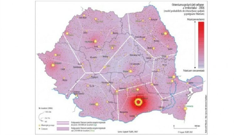 A térképet a Iaşi-i Alexandru Ioan Cuza Tudományegyetem Cuguat-Tigris központja készítette, a vidéki társadalmi áramlásokat kutató nagyszabású terv keretében. 18 nagyvárosi és ugyanakkor, alternatívaként, 18 nagy és közepes méretű városi befolyási övezetet mutat ki. Ezen kívül a tanulmányok szerint még további nagyjából 200 településnek van némi alsóbb szintű központi potenciálja.