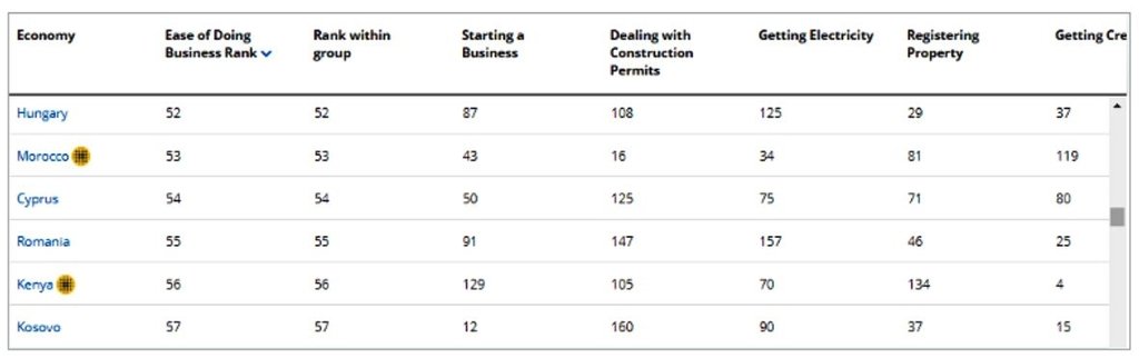 Nézzünk meg egy másik mutatót: a Világbank által összeállított „Ease of Doing Business” index: Magyarország az 52. helyen van a világon, Románia az 55. helyen. Az új vállalkozás indításának könnyűsége terén Magyarországnak 87 pontja van, nekünk 91, az építési engedély megszerzése esetében nekik 108 pontjuk van, nekünk 147, a kisebbségi tulajdonosok védelmét illetően nekik 97, nekünk 61 pontunk van, a szerződések betartásánál nekik 25, nekünk 19, a fizetésképtelenségek rendezése terén pedig nekik 66, nekünk 56 pontunk van. Ebben a rangsorban valójában egyetlen fejezetnél sorol bennünket Magyarország mögé ez a rangsor: az építési engedélyek megszerzésének nehézkességénél (a felsorolt számok és az alábbi táblázat az ellenkezőjét mutatja – a szerk..). Pontosan itt a leginkább elterjedt a korrupció (lásd a Bukarestet megfojtó észbontó építkezéseket). Mindenesetre említsük meg azt is, hogy a lengyelek és a csehek jóval előttünk járnak, a 40. és a 41. helyen, a törökök pedig a 33. helyre léptek… (forrás: ITT).