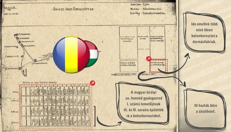 Ezen a vázlaton látható, hogy a temető bejáratától jobbra, már a határvonaltól/kerítéstől kezdődően egy négy sorból álló, soronként tizennégy sírt tartalmazó parcella található, melyben a Magyar Királyi Hadsereg 10. Honvéd Gyalogezred katonái vannak eltemetve. A szóban forgó vázlatot, magyarázó jegyzetekkel együtt, már 2019. május 7-én közzétette a Facebook-on Maria Roşu neves középkor-történész. (Maria Roşu, sajnos, nem sokkal a közzététel után elhunyt.) A dokumentum és a magyarázó jegyzetek szerint az 50 betonkeresztet a honvédsírok III. és IV. sorára telepítették. Tehát eddig ez a legrégebbi nyilvánosságra került eredeti dokumentum – és ez cáfolja az ONCE állításait. Megismételjük,