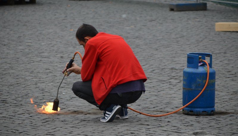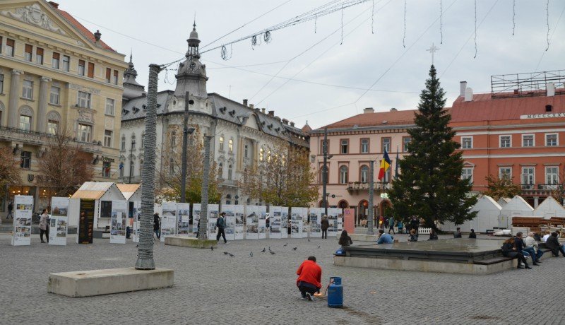 Áll tanácstalanul egy hatalmas – a csúcsdíszt és pár égőt leszámítva még csupasz – karácsonyfa november 13-án, megközelítőleg 20 fokban Kolozsvár főterén, miközben egy férfi egy gázpalackra szerelt disznópörzsölővel égeti le a tér burkolatköveiről a kiömlött olajfoltokat.