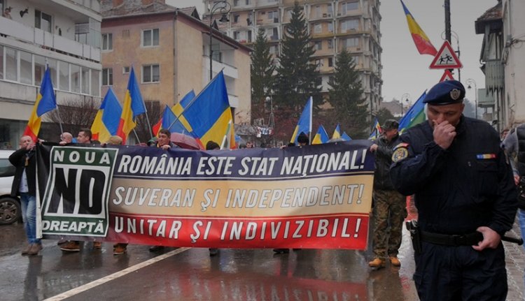 Az esőben ünneplő helybéli románok rendezvényére akaszkodtak rá a több megyéből érkezett neo-legionárius fiatalok, akik negyedik éve utaznak Háromszékre december 1-én.